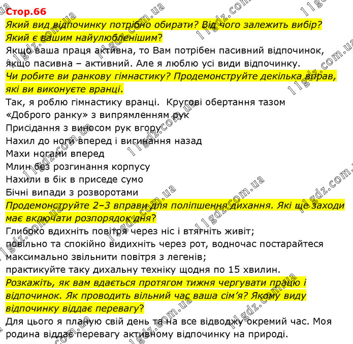 Який вид відпочинку потрібно обирати? Від чого залежить вибір? Який є вашим найулюбленішим? Якщо ваша праця активна, то Вам потрібен пасивний відпочинок, якщо пасивна – активний. Але я люблю усі види відпочинку. Чи робите ви ранкову гімнастику? Продемонструйте декілька вправ, які ви виконуєте вранці. 1. Так, я роблю гімнастику вранці. Кругові обертання тазом 2. «Доброго ранку» з випрямленням рук 3. Присідання з виносом рук вгору 4. Нахил до ноги вперед і вигинання назад 5. Махи ногами вперед 6. Млин без розгинання корпусу 7. Нахили в бік в приседе сумо 8. Бічні випади з розворотами Продемонструйте 2–3 вправи для поліпшення дихання. Які ще заходи має включати розпорядок дня? 1. Глибоко вдихніть повітря через ніс і втягніть живіт; 2. повільно та спокійно видихніть через рот, водночас постарайтеся максимально звільнити повітря з легенів; 3. практикуйте таку дихальну техніку щодня по 15 хвилин. Розкажіть, як вам вдається протягом тижня чергувати працю і відпочинок. Як проводить вільний час ваша сім’я? Якому виду відпочинку віддає перевагу? Для цього я планую свій день та на все відводжу окремий час. Моя родина віддає перевагу активному відпочинку на природі.