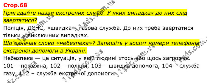 Пригадайте назви екстрених служб. У яких випадках до них слід звертатися? Поліція, ДСНС, «швидка», газова служба. До них треба звертатися тільки у виключних випадках. Що означає слово «небезпека»? Запишіть у зошит номери телефонів екстреної допомоги в Україні. Небезпека — це ситуація, у якій людині хтось або щось загрожує. 101 – пожежна, 102 – поліція, 103 – швидка допомога, 104 – служба газу, 112 – служба екстреної допомоги.