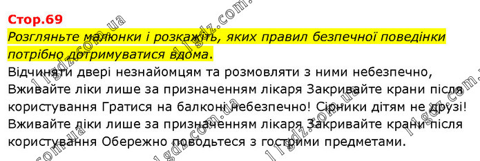 Розгляньте малюнки і розкажіть, яких правил безпечної поведінки потрібно дотримуватися вдома. Відчиняти двері незнайомцям та розмовляти з ними небезпечно, Вживайте ліки лише за призначенням лікаря Закривайте крани після користування Гратися на балконі небезпечно! Сірники дітям не друзі! Вживайте ліки лише за призначенням лікаря Закривайте крани після користування Обережно поводьтеся з гострими предметами.