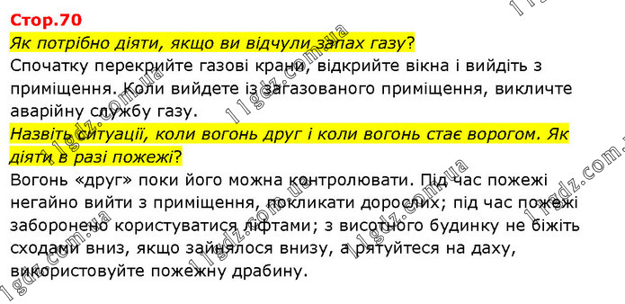 Як потрібно діяти, якщо ви відчули запах газу? Спочатку перекрийте газові крани, відкрийте вікна і вийдіть з приміщення. Коли вийдете із загазованого приміщення, викличте аварійну службу газу. Назвіть ситуації, коли вогонь друг і коли вогонь стає ворогом. Як діяти в разі пожежі? Вогонь «друг» поки його можна контролювати. Під час пожежі негайно вийти з приміщення, покликати дорослих; під час пожежі заборонено користуватися ліфтами; з висотного будинку не біжіть сходами вниз, якщо зайнялося внизу, а рятуйтеся на даху, використовуйте пожежну драбину.
