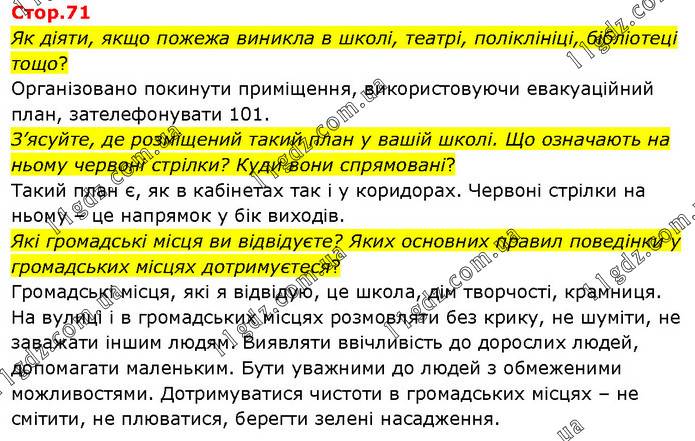 Як діяти, якщо пожежа виникла в школі, театрі, поліклініці, бібліотеці тощо? Організовано покинути приміщення, використовуючи евакуаційний план, зателефонувати 101. З’ясуйте, де розміщений такий план у вашій школі. Що означають на ньому червоні стрілки? Куди вони спрямовані? Такий план є, як в кабінетах так і у коридорах. Червоні стрілки на ньому – це напрямок у бік виходів. Які громадські місця ви відвідуєте? Яких основних правил поведінки у громадських місцях дотримуєтеся? Громадські місця, які я відвідую, це школа, дім творчості, крамниця. На вулиці і в громадських місцях розмовляти без крику, не шуміти, не заважати іншим людям. Виявляти ввічливість до дорослих людей, допомагати маленьким. Бути уважними до людей з обмеженими можливостями. Дотримуватися чистоти в громадських місцях – не смітити, не плюватися, берегти зелені насадження.