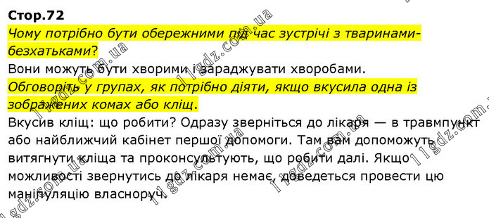 Чому потрібно бути обережними під час зустрічі з тваринами-безхатьками? Вони можуть бути хворими і зараджувати хворобами. Обговоріть у групах, як потрібно діяти, якщо вкусила одна із зображених комах або кліщ. Вкусив кліщ: що робити? Одразу зверніться до лікаря — в травмпункт або найближчий кабінет першої допомоги. Там вам допоможуть витягнути кліща та проконсультують, що робити далі. Якщо можливості звернутись до лікаря немає, доведеться провести цю маніпуляцію власноруч.