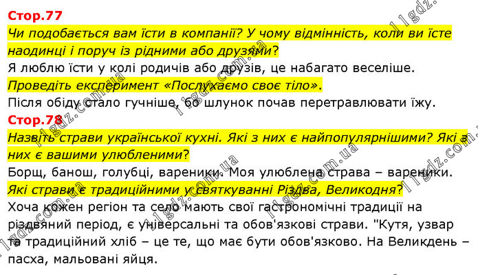 Стор.77 Чи подобається вам їсти в компанії? У чому відмінність, коли ви їсте наодинці і поруч із рідними або друзями? Я люблю їсти у колі родичів або друзів, це набагато веселіше. Проведіть експеримент «Послухаємо своє тіло». Після обіду стало гучніше, бо шлунок почав перетравлювати їжу. Стор.78 Назвіть страви української кухні. Які з них є найпопулярнішими? Які з них є вашими улюбленими? Борщ, банош, голубці, вареники. Моя улюблена страва – вареники. Які страви є традиційними у святкуванні Різдва, Великодня? Хоча кожен регіон та село мають свої гастрономічні традиції на різдвяний період, є універсальні та обов'язкові страви. "Кутя, узвар та традиційний хліб – це те, що має бути обов'язково. На Великдень – пасха, мальовані яйця.