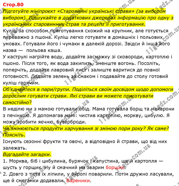 Підготуйте мініпроєкт «Старовинні українські страви» (за вибором вибором). Відшукайте в додаткових джерелах інформацію про одну з українських старовинних страв та рецепт її приготування. Куліш за способом приготування схожий на крупник, але готується переважно з пшона. Куліш легко готувати в домашніх і польових умовах. Готували його і чумаки в далекій дорозі. Звідси й інша його назва — польова каша. У каструлі нагрійте воду, додайте засмажку зі сковороди, картоплю і пшоно. Після того, як вода закипить, зменште вогонь. Посоліть, поперчіть, додайте лавровий лист і залиште варитися до повної готовності. Додайте зелень за смаком і подавайте до столу готовий куліш гарячим. Об’єднайтеся в пари/групи. Поділіться своїм досвідом щодо допомоги дорослим готувати страви. Які страви ви можете приготувати самостійно? В неділю ми з мамою готували обід. Мама готувала борщ та макарони з печінкою. Я допомагав мамі: чистив картоплю, моркву, цибулю. Я можу зробити яєчню, бутерброди. Чи змінюються продукти харчування зі зміною пори року? Як саме? Поясніть. Існують сезонні фрукти та овочі, а відповідно й страви, що від них залежать. Відгадайте загадки. 1. Морква, біб і цибулина, бурячок і капустина, ще й картопля — шусть у горщик. Ну й смачний ми зварим борщик. 2. Довго з тіста їх ліпили, у окропі поварили. Потім дружно ласували, ще й сметанки додавали. Вареники.