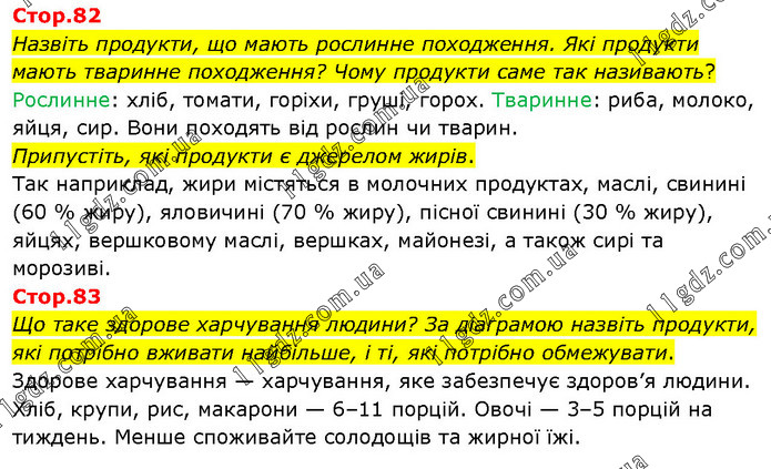 Стор.82 Назвіть продукти, що мають рослинне походження. Які продукти мають тваринне походження? Чому продукти саме так називають? Рослинне: хліб, томати, горіхи, груші, горох. Тваринне: риба, молоко, яйця, сир. Вони походять від рослин чи тварин. Припустіть, які продукти є джерелом жирів. Так наприклад, жири містяться в молочних продуктах, маслі, свинині (60 % жиру), яловичині (70 % жиру), пісної свинині (30 % жиру), яйцях, вершковому маслі, вершках, майонезі, а також сирі та морозиві. Стор.83 Що таке здорове харчування людини? За діаграмою назвіть продукти, які потрібно вживати найбільше, і ті, які потрібно обмежувати. Здорове харчування — харчування, яке забезпечує здоров’я людини. Хліб, крупи, рис, макарони — 6–11 порцій. Овочі — 3–5 порцій на тиждень. Менше споживайте солодощів та жирної їжі.