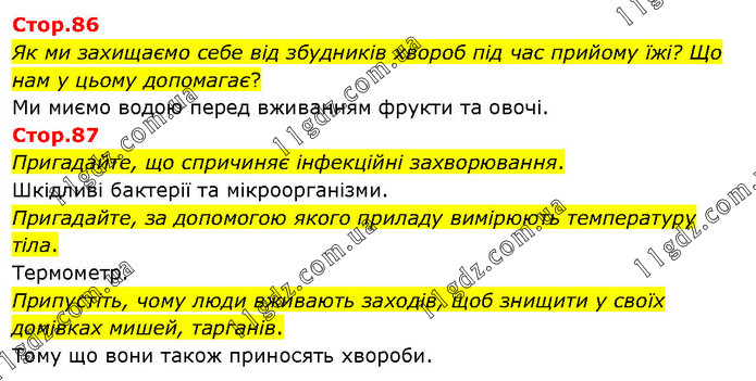 Стор.86 Як ми захищаємо себе від збудників хвороб під час прийому їжі? Що нам у цьому допомагає? Ми миємо водою перед вживанням фрукти та овочі. Стор.87 Пригадайте, що спричиняє інфекційні захворювання. Шкідливі бактерії та мікроорганізми. Пригадайте, за допомогою якого приладу вимірюють температуру тіла. Термометр. Припустіть, чому люди вживають заходів, щоб знищити у своїх домівках мишей, тарганів. Тому що вони також приносять хвороби.