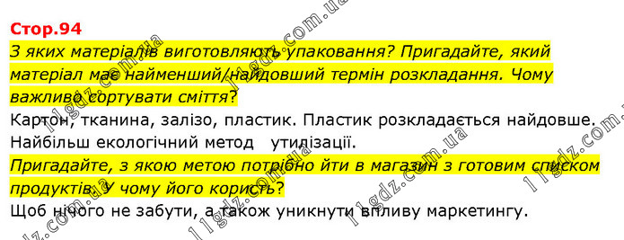 З яких матеріалів виготовляють упаковання? Пригадайте, який матеріал має найменший/найдовший термін розкладання. Чому важливо сортувати сміття? Картон, тканина, залізо, пластик. Пластик розкладається найдовше. Найбільш екологічний метод утилізації. Пригадайте, з якою метою потрібно йти в магазин з готовим списком продуктів. У чому його користь? Щоб нічого не забути, а також уникнути впливу маркетингу.