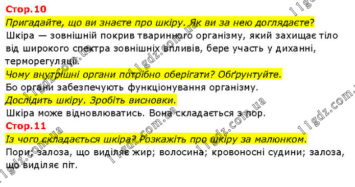 Стор.10 Пригадайте, що ви знаєте про шкіру. Як ви за нею доглядаєте? Шкіра — зовнішній покрив тваринного організму, який захищає тіло від широкого спектра зовнішніх впливів, бере участь у диханні, терморегуляції. Чому внутрішні органи потрібно оберігати? Обґрунтуйте. Бо органи забезпечують функціонування організму. Дослідить шкіру. Зробіть висновки. Шкіра може відновлюватись. Вона складається з пор. Стор.11 Із чого складається шкіра? Розкажіть про шкіру за малюнком. Пори; залоза, що виділяє жир; волосина; кровоносні судини; залоза, що виділяє піт.