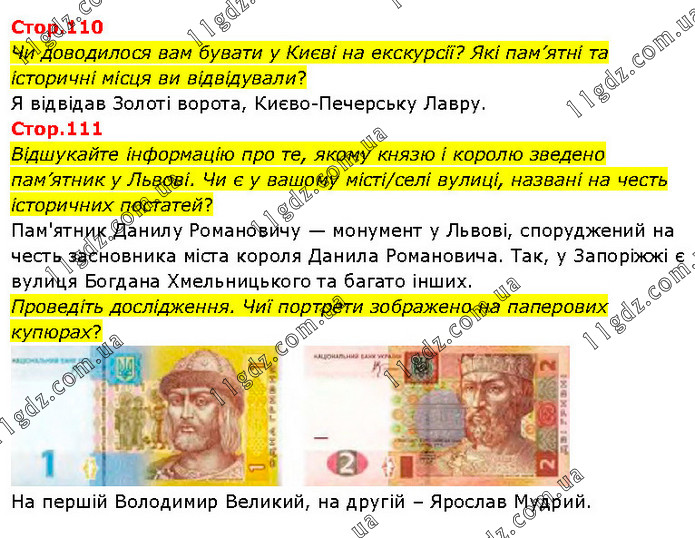 Стор.110 Чи доводилося вам бувати у Києві на екскурсії? Які пам’ятні та історичні місця ви відвідували? Я відвідав Золоті ворота, Києво-Печерську Лавру. Стор.111 Відшукайте інформацію про те, якому князю і королю зведено пам’ятник у Львові. Чи є у вашому місті/селі вулиці, названі на честь історичних постатей? Пам'ятник Данилу Романовичу — монумент у Львові, споруджений на честь засновника міста короля Данила Романовича. Так, у Запоріжжі є вулиця Богдана Хмельницького та багато інших. Проведіть дослідження. Чиї портрети зображено на паперових купюрах? На першій Володимир Великий, на другій – Ярослав Мудрий.