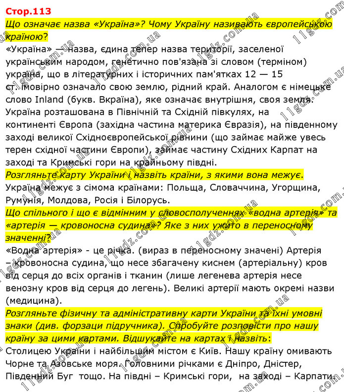 Що означає назва «Україна»? Чому Україну називають європейською країною? «Україна» — назва, єдина тепер назва території, заселеної українським народом, генетично пов'язана зі словом (терміном) україна, що в літературних і історичних пам'ятках 12 — 15 ст. імовірно означало свою землю, рідний край. Аналогом є німецьке слово Inland (букв. Вкраїна), яке означає внутрішня, своя земля. Україна розташована в Північній та Східній півкулях, на континенті Європа (західна частина материка Євразія), на південному заході великої Східноєвропейської рівнини (що займає майже увесь терен східної частини Європи), займає частину Східних Карпат на заході та Кримські гори на крайньому півдні. Розгляньте карту України і назвіть країни, з якими вона межує. Україна межує з сімома країнами: Польща, Словаччина, Угорщина, Румунія, Молдова, Росія і Білорусь. Що спільного і що є відмінним у словосполученнях «водна артерія» та «артерія — кровоносна судина»? Яке з них ужито в переносному значенні? «Водна артерія» - це річка. (вираз в переносному значені) Артерія – кровоносна судина, що несе збагачену киснем (артеріальну) кров від серця до всіх органів і тканин (лише легенева артерія несе венозну кров від серця до легень). Великі артерії мають окремі назви (медицина). Розгляньте фізичну та адміністративну карти України та їхні умовні знаки (див. форзаци підручника). Спробуйте розповісти про нашу країну за цими картами. Відшукайте на картах і назвіть: Столицею України і найбільшим містом є Київ. Нашу країну омивають Чорне та Азовське моря. Головними річками є Дніпро, Дністер, Південний Буг тощо. На півдні – Кримські гори, на заході – Карпати.