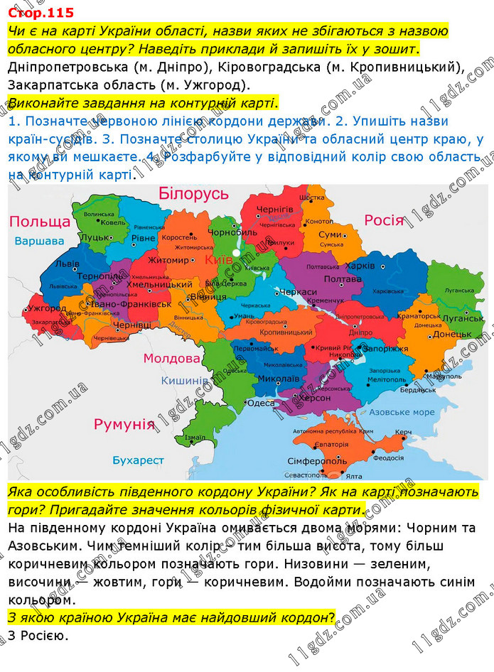 Чи є на карті України області, назви яких не збігаються з назвою обласного центру? Наведіть приклади й запишіть їх у зошит. Дніпропетровська (м. Дніпро), Кіровоградська (м. Кропивницький), Закарпатська область (м. Ужгород). Виконайте завдання на контурній карті. 1. Позначте червоною лінією кордони держави. 2. Упишіть назви країн-сусідів. 3. Позначте столицю України та обласний центр краю, у якому ви мешкаєте. 4. Розфарбуйте у відповідний колір свою область на контурній карті. Яка особливість південного кордону України? Як на карті позначають гори? Пригадайте значення кольорів фізичної карти. На південному кордоні Україна омивається двома морями: Чорним та Азовським. Чим темніший колір – тим більша висота, тому більш коричневим кольором позначають гори. Низовини — зеленим, височини — жовтим, гори — коричневим. Водойми позначають синім кольором. З якою країною Україна має найдовший кордон? З Росією.