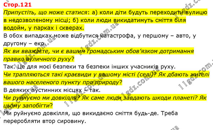 Припустіть, що може статися: а) коли діти будуть переходити вулицю в недозволеному місці; б) коли люди викидатимуть сміття біля водойм, у парках і скверах. В обох випадках може відбутися катастрофа, у першому – авто, у другому – еко. Як ви вважаєте, чи є вашим громадським обов’язком дотримання правил вуличного руху? Так. Це для моєї безпеки та безпеки інших учасників руху. Чи трапляються такі краєвиди у вашому місті (селі)? Як дбають жителі вашого населеного пункту про природу? В деяких пустинних місцях – так. Чи руйнуємо ми довкілля? Як саме люди завдають шкоди планеті? Як цьому запобігти? Ми руйнуємо довкілля, що викидаємо сміття будь-де. Треба переробляти втор сировину.