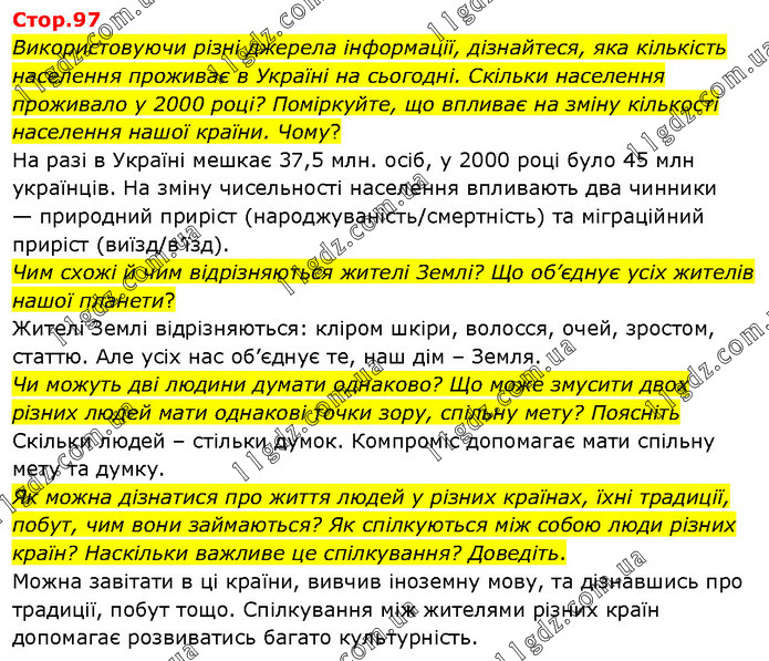 Використовуючи різні джерела інформації, дізнайтеся, яка кількість населення проживає в Україні на сьогодні. Скільки населення проживало у 2000 році? Поміркуйте, що впливає на зміну кількості населення нашої країни. Чому? На разі в Україні мешкає 37,5 млн. осіб, у 2000 році було 45 млн українців. На зміну чисельності населення впливають два чинники — природний приріст (народжуваність/смертність) та міграційний приріст (виїзд/в’їзд). Чим схожі й чим відрізняються жителі Землі? Що об’єднує усіх жителів нашої планети? Жителі Землі відрізняються: кліром шкіри, волосся, очей, зростом, статтю. Але усіх нас об’єднує те, наш дім – Земля. Чи можуть дві людини думати однаково? Що може змусити двох різних людей мати однакові точки зору, спільну мету? Поясніть Скільки людей – стільки думок. Компроміс допомагає мати спільну мету та думку. Як можна дізнатися про життя людей у різних країнах, їхні традиції, побут, чим вони займаються? Як спілкуються між собою люди різних країн? Наскільки важливе це спілкування? Доведіть. Можна завітати в ці країни, вивчив іноземну мову, та дізнавшись про традиції, побут тощо. Спілкування між жителями різних країн допомагає розвиватись багато культурність.
