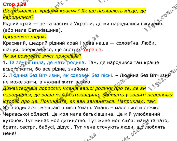 Що називають «рідним краєм»? Як ще називають місце, де народилися? Рідний край — це та частина України, де ми народилися і живемо. (або мала Батьківщина). Продовжте рядок. Красивий, щедрий рідний край і мова наша — солов’їна. Люби, шануй, оберігай усе, що зветься Україна. Як ви розумієте зміст прислів’їв? 1. Та земля мила, де мати родила. Там, де народився там краще всього жити, бо все рідне, знайоме. 2. Людина без Вітчизни, як соловей без пісні. – Людина без Вітчизни не може жити, в чужині жити важко. Дізнайтеся від дорослих членів вашої родини про те, де ви народилися, де ваша мала батьківщина. Запишіть у зошиті невеличку історію про це. Починайте, як вам заманеться. Наприклад, так: Я народилася і мешкаю в місті Умані. Умань – маленьке містечко Черкаської області. Це моя мала батьківщина. Це мій улюблений куточок. Тут минає моє дитинство. Тут живе моя сім'я: мама та тато, брати, сестри, бабусі, дідусі. Тут мене оточують люди, що люблять мене!