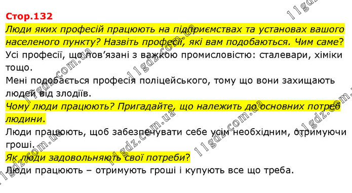 Люди яких професій працюють на підприємствах та установах вашого населеного пункту? Назвіть професії, які вам подобаються. Чим саме? Усі професії, що пов’язані з важкою промисловістю: сталевари, хіміки тощо. Мені подобається професія поліцейського, тому що вони захищають людей від злодіїв. Чому люди працюють? Пригадайте, що належить до основних потреб людини. Люди працюють, щоб забезпечувати себе усім необхідним, отримуючи гроші. Як люди задовольняють свої потреби? Люди працюють – отримують гроші і купують все що треба.
