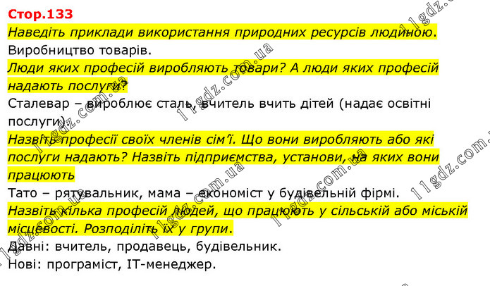 Наведіть приклади використання природних ресурсів людиною. Виробництво товарів. Люди яких професій виробляють товари? А люди яких професій надають послуги? Сталевар – вироблює сталь, вчитель вчить дітей (надає освітні послуги). Назвіть професії своїх членів сім’ї. Що вони виробляють або які послуги надають? Назвіть підприємства, установи, на яких вони працюють Тато – рятувальник, мама – економіст у будівельній фірмі. Назвіть кілька професій людей, що працюють у сільській або міській місцевості. Розподіліть їх у групи. Давні: вчитель, продавець, будівельник. Нові: програміст, ІТ-менеджер.