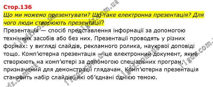 Що ми можемо презентувати? Що таке електронна презентація? Для чого люди створюють презентації? Презентація — спосіб представлення інформації за допомогою технічних засобів або без них. Презентації проводять у різних формах: у вигляді слайдів, рекламного ролика, наукової доповіді тощо. Комп’ютерна презентація — це електронний документ, який створюють на комп’ютері за допомогою спеціальних програм, призначений для демонстрації глядачам. Комп’ютерна презентація становить набір слайдів, які об’єднані однією темою.