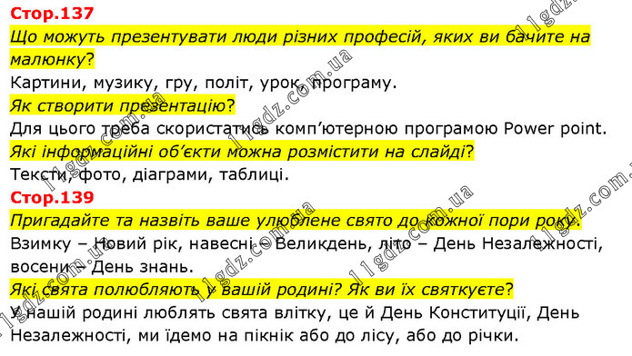 Стор.137 Що можуть презентувати люди різних професій, яких ви бачите на малюнку? Картини, музику, гру, політ, урок, програму. Як створити презентацію? Для цього треба скористатись комп’ютерною програмою Power point. Які інформаційні об’єкти можна розмістити на слайді? Тексти, фото, діаграми, таблиці. Стор.139 Пригадайте та назвіть ваше улюблене свято до кожної пори року. Взимку – Новий рік, навесні – Великдень, літо – День Незалежності, восени – День знань. Які свята полюбляють у вашій родині? Як ви їх святкуєте? У нашій родині люблять свята влітку, це й День Конституції, День Незалежності, ми їдемо на пікнік або до лісу, або до річки.