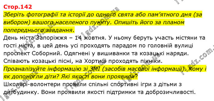 Зберіть фотографії та історії до одного свята або пам’ятного дня (за вибором) вашого населеного пункту. Опишіть його за планом попереднього завдання. День міста Запоріжжя – 14 жовтня. У ньому беруть участь містяни та гості міста, в цей день усі проходять парадом по головній вулиці проспект Соборний. Одягнені у вишиванки та козацькі наряди. Співають козацькі пісні, на Хортиці проходять пікніки. Проаналізуйте інформацію зі ЗМІ (засобів масової інформації). Кому і як допомогли діти? Які якості вони проявили? Школярі-волонтери провели спільні спортивні ігри з дітьми з дитбудинку. Вони проявили якості підтримки та доброзичливості.
