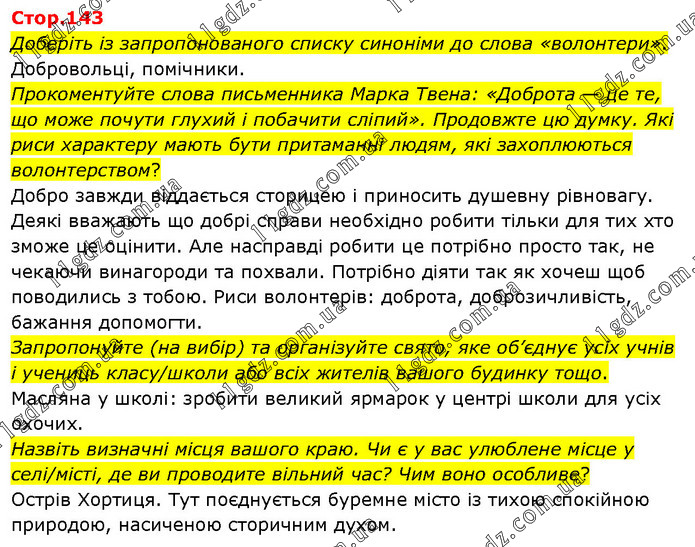 Доберіть із запропонованого списку синоніми до слова «волонтери». Добровольці, помічники. Прокоментуйте слова письменника Марка Твена: «Доброта — це те, що може почути глухий і побачити сліпий». Продовжте цю думку. Які риси характеру мають бути притаманні людям, які захоплюються волонтерством? Добро завжди віддається сторицею і приносить душевну рівновагу. Деякі вважають що добрі справи необхідно робити тільки для тих хто зможе це оцінити. Але насправді робити це потрібно просто так, не чекаючи винагороди та похвали. Потрібно діяти так як хочеш щоб поводились з тобою. Риси волонтерів: доброта, доброзичливість, бажання допомогти. Запропонуйте (на вибір) та організуйте свято, яке об’єднує усіх учнів і учениць класу/школи або всіх жителів вашого будинку тощо. Масляна у школі: зробити великий ярмарок у центрі школи для усіх охочих. Назвіть визначні місця вашого краю. Чи є у вас улюблене місце у селі/місті, де ви проводите вільний час? Чим воно особливе? Острів Хортиця. Тут поєднується буремне місто із тихою спокійною природою, насиченою сторичним духом.
