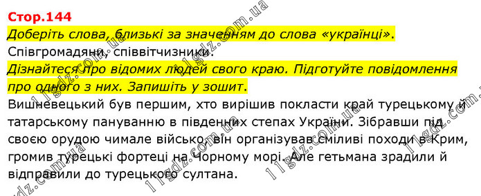 Доберіть слова, близькі за значенням до слова «українці». Співгромадяни, співвітчизники. Дізнайтеся про відомих людей свого краю. Підготуйте повідомлення про одного з них. Запишіть у зошит. Вишневецький був першим, хто вирішив покласти край турецькому й татарському пануванню в південних степах України. Зібравши під своєю орудою чимале військо, він організував сміливі походи в Крим, громив турецькі фортеці на Чорному морі. Але гетьмана зрадили й відправили до турецького султана.