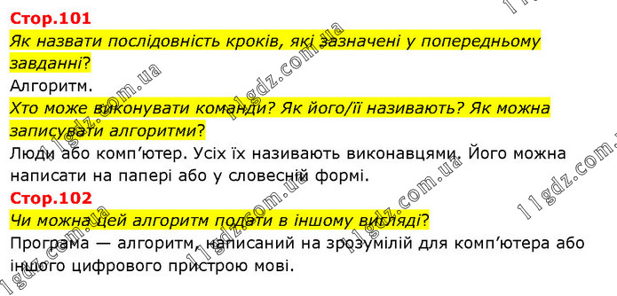 Стор.101 Як назвати послідовність кроків, які зазначені у попередньому завданні? Алгоритм. Хто може виконувати команди? Як його/її називають? Як можна записувати алгоритми? Люди або комп’ютер. Усіх їх називають виконавцями. Його можна написати на папері або у словесній формі. Стор.102 Чи можна цей алгоритм подати в іншому вигляді? Програма — алгоритм, написаний на зрозумілій для комп’ютера або іншого цифрового пристрою мові.