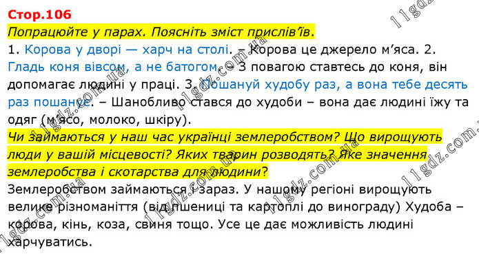 Попрацюйте у парах. Поясніть зміст прислів’їв. 1. Корова у дворі — харч на столі. – Корова це джерело м’яса. 2. Гладь коня вівсом, а не батогом. – З повагою ставтесь до коня, він допомагає людині у праці. 3. Пошануй худобу раз, а вона тебе десять раз пошанує. – Шанобливо стався до худоби – вона дає людині їжу та одяг (м’ясо, молоко, шкіру). Чи займаються у наш час українці землеробством? Що вирощують люди у вашій місцевості? Яких тварин розводять? Яке значення землеробства і скотарства для людини? Землеробством займаються і зараз. У нашому регіоні вирощують велике різноманіття (від пшениці та картоплі до винограду) Худоба – корова, кінь, коза, свиня тощо. Усе це дає можливість людині харчуватись.