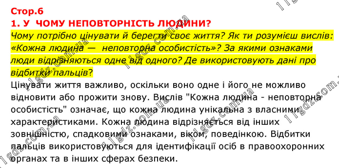 1. У ЧОМУ НЕПОВТОРНІСТЬ ЛЮДИНИ? Чому потрібно цінувати й берегти своє життя? Як ти розумієш вислів: «Кожна людина — неповторна особистість»? За якими ознаками люди відрізняються одне від одного? Де використовують дані про відбитки пальців? Цінувати життя важливо, оскільки воно одне і його не можливо відновити або прожити знову. Вислів "Кожна людина - неповторна особистість" означає, що кожна людина унікальна з власними характеристиками. Кожна людина відрізняється від інших зовнішністю, спадковими ознаками, віком, поведінкою. Відбитки пальців використовуються для ідентифікації осіб в правоохоронних органах та в інших сферах безпеки.