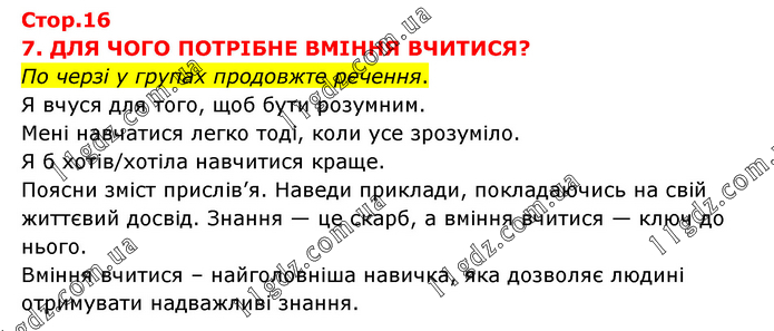 7. ДЛЯ ЧОГО ПОТРІБНЕ ВМІННЯ ВЧИТИСЯ? По черзі у групах продовжте речення. Я вчуся для того, щоб бути розумним. Мені навчатися легко тоді, коли усе зрозуміло. Я б хотів/хотіла навчитися краще. Поясни зміст прислів’я. Наведи приклади, покладаючись на свій життєвий досвід. Знання — це скарб, а вміння вчитися — ключ до нього. Вміння вчитися – найголовніша навичка, яка дозволяє людині отримувати надважливі знання.