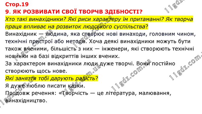 9. ЯК РОЗВИВАТИ СВОЇ ТВОРЧВ ЗДІБНОСТІ? Хто такі винахідники? Які риси характеру їм притаманні? Як творча праця впливає на розвиток людського суспільства? Винахідник — людина, яка створює нові винаходи, головним чином, технічні пристрої або методи. Хоча деякі винахідники можуть бути також вченими, більшість з них — інженери, які створюють технічні новинки на базі відкриттів інших вчених. За характером винахідники люди дуже творчі. Вони постійно створюють щось нове. Які заняття тобі дарують радість? Я дуже люблю писати казки. Продовж речення: «Творчість — це література, малювання, винахідництво.