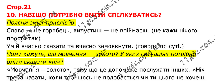 10. НАВІЩО ПОТРІБНО ВМІТИ СПІЛКУВАТИСЬ? Поясни зміст прислів’їв. Слово — не горобець, випустиш — не впіймаєш. (не кажи нічого просто так) Умій вчасно сказати та вчасно замовкнути. (говори по суті.) Чому кажуть, що мовчання — золото? У яких ситуаціях потрібно вміти сказати «ні»? «Мовчання – золото», тому що це допоможе послухати інших. «Ні» треба казати, коли тобі щось не подобається чи ти цього не хочеш.