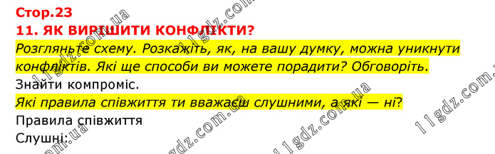 11. ЯК ВИРІШИТИ КОНФЛІКТИ? Розгляньте схему. Розкажіть, як, на вашу думку, можна уникнути конфліктів. Які ще способи ви можете порадити? Обговоріть. Знайти компроміс. Які правила співжиття ти вважаєш слушними, а які — ні? Правила співжиття Слушні: