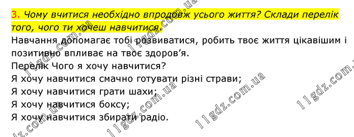 3. Чому вчитися необхідно впродовж усього життя? Склади перелік того, чого ти хочеш навчитися. Навчання допомагає тобі розвиватися, робить твоє життя цікавішим і позитивно впливає на твоє здоров’я. Перелік Чого я хочу навчитися? Я хочу навчитися смачно готувати різні страви; Я хочу навчитися грати шахи; Я хочу навчитися боксу; Я хочу навчитися збирати радіо.