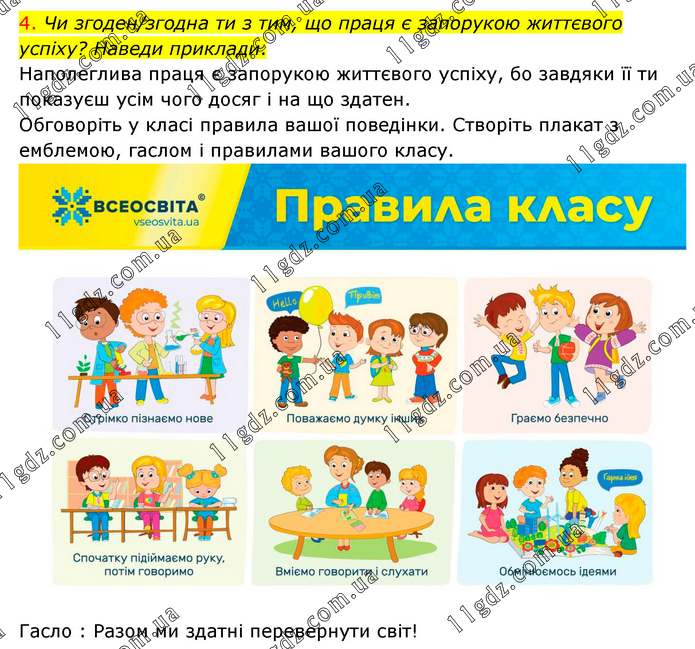 4. Чи згоден/згодна ти з тим, що праця є запорукою життєвого успіху? Наведи приклади. Наполеглива праця є запорукою життєвого успіху, бо завдяки її ти показуєш усім чого досяг і на що здатен. Обговоріть у класі правила вашої поведінки. Створіть плакат з емблемою, гаслом і правилами вашого класу. Гасло : Разом ми здатні перевернути світ!