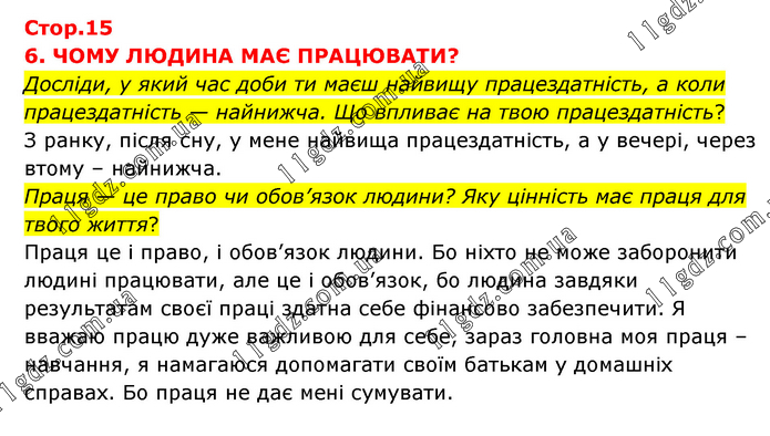 6. ЧОМУ ЛЮДИНА МАЄ ПРАЦЮВАТИ? Досліди, у який час доби ти маєш найвищу працездатність, а коли працездатність — найнижча. Що впливає на твою працездатність? З ранку, після сну, у мене найвища працездатність, а у вечері, через втому – найнижча. Праця — це право чи обов’язок людини? Яку цінність має праця для твого життя? Праця це і право, і обов’язок людини. Бо ніхто не може заборонити людині працювати, але це і обов’язок, бо людина завдяки результатам своєї праці здатна себе фінансово забезпечити. Я вважаю працю дуже важливою для себе, зараз головна моя праця – навчання, я намагаюся допомагати своїм батькам у домашніх справах. Бо праця не дає мені сумувати.