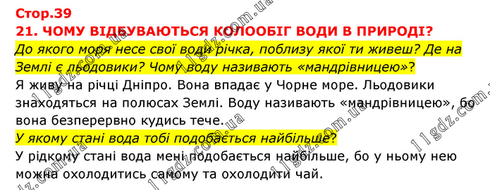 21. ЧОМУ ВІДБУВАЮТЬСЯ КОЛООБІГ ВОДИ В ПРИРОДІ? До якого моря несе свої води річка, поблизу якої ти живеш? Де на Землі є льодовики? Чому воду називають «мандрівницею»? Я живу на річці Дніпро. Вона впадає у Чорне море. Льодовики знаходяться на полюсах Землі. Воду називають «мандрівницею», бо вона безперервно кудись тече. У якому стані вода тобі подобається найбільше? У рідкому стані вода мені подобається найбільше, бо у ньому нею можна охолодитись самому та охолодити чай.