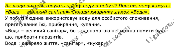 Як люди використовують прісну воду в побуті? Поясни, чому кажуть: «Вода — великий санітар». Склади хмаринку думок «Вода». У побуті людина використовує воду для особистого споживання, приготування їжі, прибирання, купання. «Вода – великий санітар», бо за допомогою неї можна помити будь-що, прибрати паразитів. Вода : джерело життя, «санітар», «кухар».