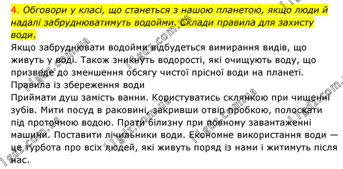 4. Обговори у класі, що станеться з нашою планетою, якщо люди й надалі забруднюватимуть водойми. Склади правила для захисту води. Якщо забруднювати водойми відбудеться вимирання видів, що живуть у воді. Також зникнуть водорості, які очищують воду, що призведе до зменшення обсягу чистої прісної води на планеті. Правила із збереження води Приймати душ замість ванни. Користуватись склянкою при чищенні зубів. Мити посуд в раковині, закривши отвір пробкою, полоскати під проточною водою. Прати білизну при повному завантаженні машини. Поставити лічильники води. Економне використання води — це турбота про всіх людей, які живуть поряд із нами і житимуть після нас.