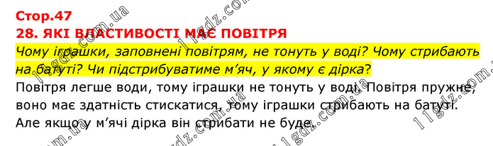 28. ЯКІ ВЛАСТИВОСТІ МАЄ ПОВІТРЯ Чому іграшки, заповнені повітрям, не тонуть у воді? Чому стрибають на батуті? Чи підстрибуватиме м’яч, у якому є дірка? Повітря легше води, тому іграшки не тонуть у воді. Повітря пружне, воно має здатність стискатися, тому іграшки стрибають на батуті. Але якщо у м’ячі дірка він стрибати не буде.