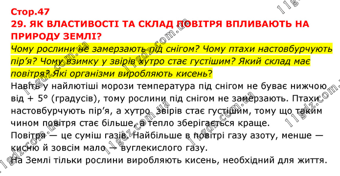 29. ЯК ВЛАСТИВОСТІ ТА СКЛАД ПОВІТРЯ ВПЛИВАЮТЬ НА ПРИРОДУ ЗЕМЛІ? Чому рослини не замерзають під снігом? Чому птахи настовбурчують пір’я? Чому взимку у звірів хутро стає густішим? Який склад має повітря? Які організми виробляють кисень? Навіть у найлютіші морози температура під снігом не буває нижчою від + 5° (градусів), тому рослини під снігом не замерзають. Птахи настовбурчують пір’я, а хутро звірів стає густішим, тому що таким чином повітря стає більше, а тепло зберігається краще. Повітря — це суміш газів. Найбільше в повітрі газу азоту, менше — кисню й зовсім мало — вуглекислого газу. На Землі тільки рослини виробляють кисень, необхідний для життя.