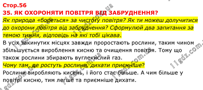 35. ЯК ОХОРОНЯТИ ПОВІТРЯ ВІД ЗАБРУДНЕННЯ? Як природа «бореться» за чистоту повітря? Як ти можеш долучитися до охорони повітря від забруднення? Сформулюй два запитання за темою тижня, відповідь на які тобі цікава. В усіх закинутих місцях завжди проростають рослини, таким чином збільшується вироблення кисню та очищення повітря. Тому що також рослини збирають вуглекислий газ. Чому там, де ростуть рослини, дихати приємніше? Рослини виробляють кисень, і його стає більше. А чим більше у повітрі кисню, тим легше та приємніше дихати.
