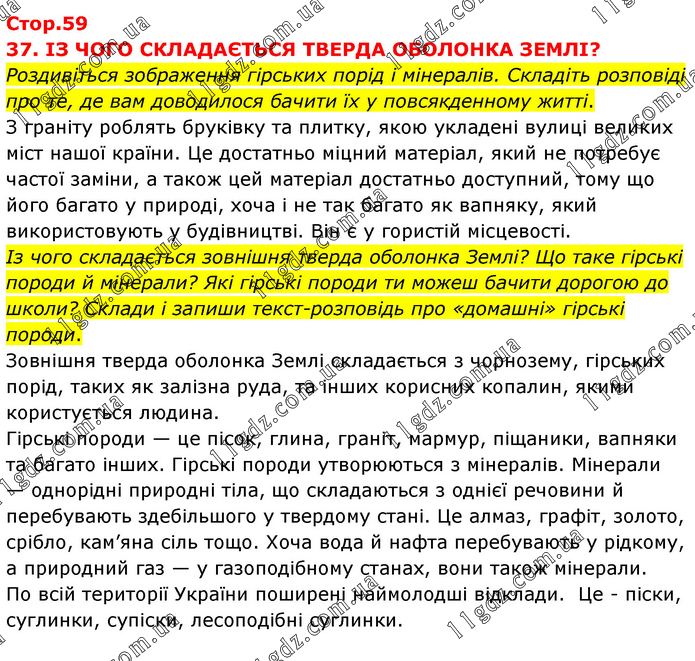 37. ІЗ ЧОГО СКЛАДАЄТЬСЯ ТВЕРДА ОБОЛОНКА ЗЕМЛІ? Роздивіться зображення гірських порід і мінералів. Складіть розповіді про те, де вам доводилося бачити їх у повсякденному житті. З граніту роблять бруківку та плитку, якою укладені вулиці великих міст нашої країни. Це достатньо міцний матеріал, який не потребує частої заміни, а також цей матеріал достатньо доступний, тому що його багато у природі, хоча і не так багато як вапняку, який використовують у будівництві. Він є у гористій місцевості. Із чого складається зовнішня тверда оболонка Землі? Що таке гірські породи й мінерали? Які гірські породи ти можеш бачити дорогою до школи? Склади і запиши текст-розповідь про «домашні» гірські породи. Зовнішня тверда оболонка Землі складається з чорнозему, гірських порід, таких як залізна руда, та інших корисних копалин, якими користується людина. Гірські породи — це пісок, глина, граніт, мармур, піщаники, вапняки та багато інших. Гірські породи утворюються з мінералів. Мінерали — однорідні природні тіла, що складаються з однієї речовини й перебувають здебільшого у твердому стані. Це алмаз, графіт, золото, срібло, кам’яна сіль тощо. Хоча вода й нафта перебувають у рідкому, а природний газ — у газоподібному станах, вони також мінерали. По всій території України поширені наймолодші відклади. Це - піски, суглинки, супіски, лесоподібні суглинки.