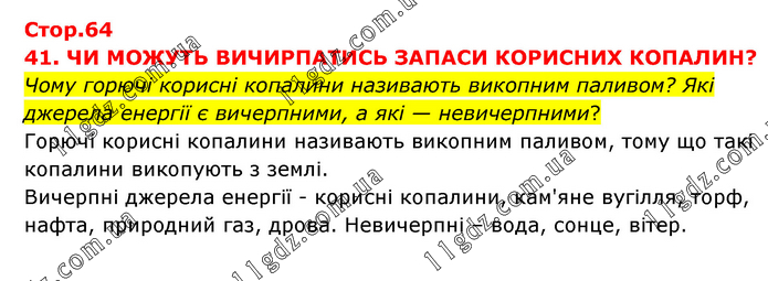 41. ЧИ МОЖУТЬ ВИЧИРПАТИСЬ ЗАПАСИ КОРИСНИХ КОПАЛИН? Чому горючі корисні копалини називають викопним паливом? Які джерела енергії є вичерпними, а які — невичерпними? Горючі корисні копалини називають викопним паливом, тому що такі копалини викопують з землі. Вичерпні джерела енергії - корисні копалини, кам'яне вугілля, торф, нафта, природний газ, дрова. Невичерпні – вода, сонце, вітер.