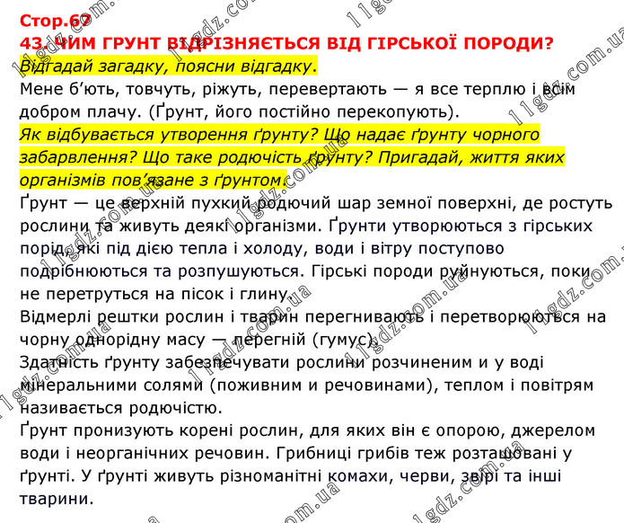 43. ЧИМ ГРУНТ ВІДРІЗНЯЄТЬСЯ ВІД ГІРСЬКОЇ ПОРОДИ? Відгадай загадку, поясни відгадку. Мене б’ють, товчуть, ріжуть, перевертають — я все терплю і всім добром плачу. (Ґрунт, його постійно перекопують). Як відбувається утворення ґрунту? Що надає ґрунту чорного забарвлення? Що таке родючість ґрунту? Пригадай, життя яких організмів пов’язане з ґрунтом. Ґрунт — це верхній пухкий родючий шар земної поверхні, де ростуть рослини та живуть деякі організми. Ґрунти утворюються з гірських порід, які під дією тепла і холоду, води і вітру поступово подрібнюються та розпушуються. Гірські породи руйнуються, поки не перетруться на пісок і глину. Відмерлі рештки рослин і тварин перегнивають і перетворюються на чорну однорідну масу — перегній (гумус). Здатність ґрунту забезпечувати рослини розчиненим и у воді мінеральними солями (поживним и речовинами), теплом і повітрям називається родючістю. Ґрунт пронизують корені рослин, для яких він є опорою, джерелом води і неорганічних речовин. Грибниці грибів теж розташовані у ґрунті. У ґрунті живуть різноманітні комахи, черви, звірі та інші тварини.