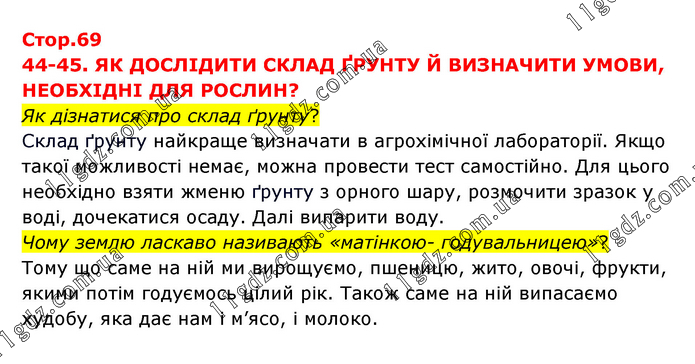 44-45. ЯК ДОСЛІДИТИ СКЛАД ҐРУНТУ Й ВИЗНАЧИТИ УМОВИ, НЕОБХІДНІ ДЛЯ РОСЛИН? Як дізнатися про склад ґрунту? Склад ґрунту найкраще визначати в агрохімічної лабораторії. Якщо такої можливості немає, можна провести тест самостійно. Для цього необхідно взяти жменю ґрунту з орного шару, розмочити зразок у воді, дочекатися осаду. Далі випарити воду. Чому землю ласкаво називають «матінкою- годувальницею»? Тому що саме на ній ми вирощуємо, пшеницю, жито, овочі, фрукти, якими потім годуємось цілий рік. Також саме на ній випасаємо худобу, яка дає нам і м’ясо, і молоко.