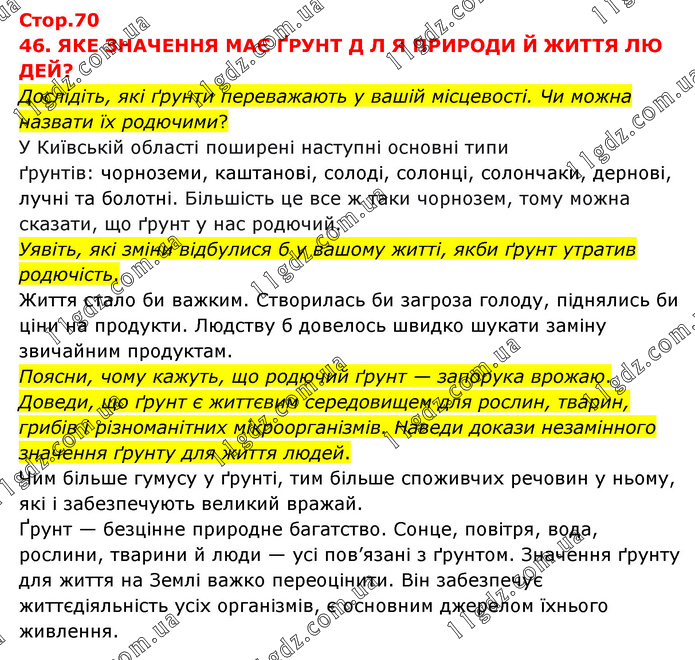 46. ЯКЕ ЗНАЧЕННЯ МАЄ ҐРУНТ Д Л Я ПРИРОДИ Й ЖИТТЯ ЛЮ ДЕЙ? Дослідіть, які ґрунти переважають у вашій місцевості. Чи можна назвати їх родючими? У Київській області поширені наступні основні типи ґрунтів: чорноземи, каштанові, солоді, солонці, солончаки, дернові, лучні та болотні. Більшість це все ж таки чорнозем, тому можна сказати, що ґрунт у нас родючий. Уявіть, які зміни відбулися б у вашому житті, якби ґрунт утратив родючість. Життя стало би важким. Створилась би загроза голоду, піднялись би ціни на продукти. Людству б довелось швидко шукати заміну звичайним продуктам. Поясни, чому кажуть, що родючий ґрунт — запорука врожаю. Доведи, що ґрунт є життєвим середовищем для рослин, тварин, грибів і різноманітних мікроорганізмів. Наведи докази незамінного значення ґрунту для життя людей. Чим більше гумусу у ґрунті, тим більше споживчих речовин у ньому, які і забезпечують великий вражай. Ґрунт — безцінне природне багатство. Сонце, повітря, вода, рослини, тварини й люди — усі пов’язані з ґрунтом. Значення ґрунту для життя на Землі важко переоцінити. Він забезпечує життєдіяльність усіх організмів, є основним джерелом їхнього живлення.