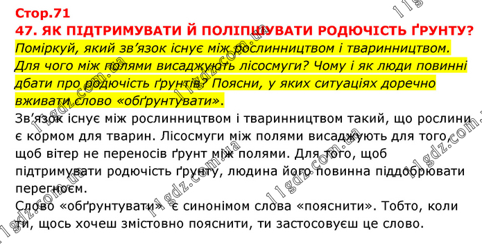 47. ЯК ПІДТРИМУВАТИ Й ПОЛІПШУВАТИ РОДЮЧІСТЬ ҐРУНТУ? Поміркуй, який зв’язок існує між рослинництвом і тваринництвом. Для чого між полями висаджують лісосмуги? Чому і як люди повинні дбати про родючість ґрунтів? Поясни, у яких ситуаціях доречно вживати слово «обґрунтувати». Зв’язок існує між рослинництвом і тваринництвом такий, що рослини є кормом для тварин. Лісосмуги між полями висаджують для того, щоб вітер не переносів ґрунт між полями. Для того, щоб підтримувати родючість ґрунту, людина його повинна піддобрювати перегноєм. Слово «обґрунтувати» є синонімом слова «пояснити». Тобто, коли ти, щось хочеш змістовно пояснити, ти застосовуєш це слово.
