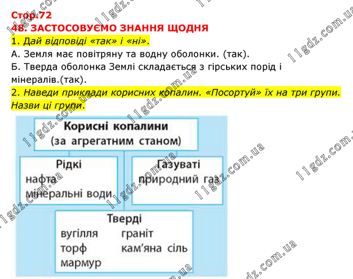 48. ЗАСТОСОВУЄМО ЗНАННЯ ЩОДНЯ 1. Дай відповіді «так» і «ні». А. Земля має повітряну та водну оболонки. (так). Б. Тверда оболонка Землі складається з гірських порід і мінералів.(так). 2. Наведи приклади корисних копалин. «Посортуй» їх на три групи. Назви ці групи.