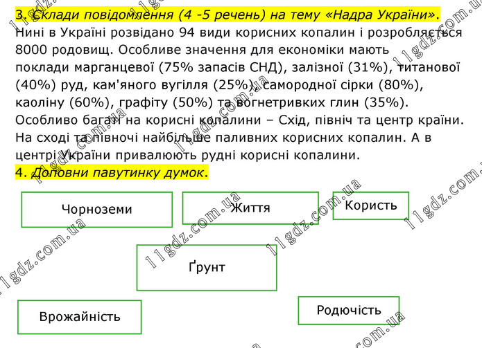3. Склади повідомлення (4 -5 речень) на тему «Надра України». Нині в Україні розвідано 94 види корисних копалин і розробляється 8000 родовищ. Особливе значення для економіки мають поклади марганцевої (75% запасів СНД), залізної (31%), титанової (40%) руд, кам'яного вугілля (25%), самородної сірки (80%), каоліну (60%), графіту (50%) та вогнетривких глин (35%). Особливо багаті на корисні копалини – Схід, північ та центр країни. На сході та півночі найбільше паливних корисних копалин. А в центрі України привалюють рудні корисні копалини. 4. Доповни павутинку думок