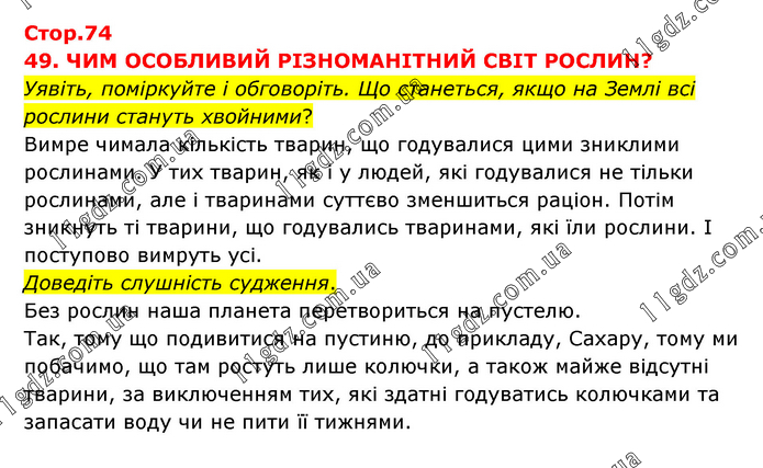 49. ЧИМ ОСОБЛИВИЙ РІЗНОМАНІТНИЙ СВІТ РОСЛИН? Уявіть, поміркуйте і обговоріть. Що станеться, якщо на Землі всі рослини стануть хвойними? Вимре чимала кількість тварин, що годувалися цими зниклими рослинами. У тих тварин, як і у людей, які годувалися не тільки рослинами, але і тваринами суттєво зменшиться раціон. Потім зникнуть ті тварини, що годувались тваринами, які їли рослини. І поступово вимруть усі. Доведіть слушність судження. Без рослин наша планета перетвориться на пустелю. Так, тому що подивитися на пустиню, до прикладу, Сахару, тому ми побачимо, що там ростуть лише колючки, а також майже відсутні тварини, за виключенням тих, які здатні годуватись колючками та запасати воду чи не пити її тижнями.